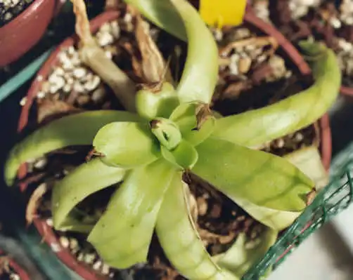 Typical damage of spider mites attack during dry and hot summer. The brown tip is the result of the bites of the spider mites in the heart of this Pinguicula. After a well choose chemical treatment, this plant will recover a safe growth.
